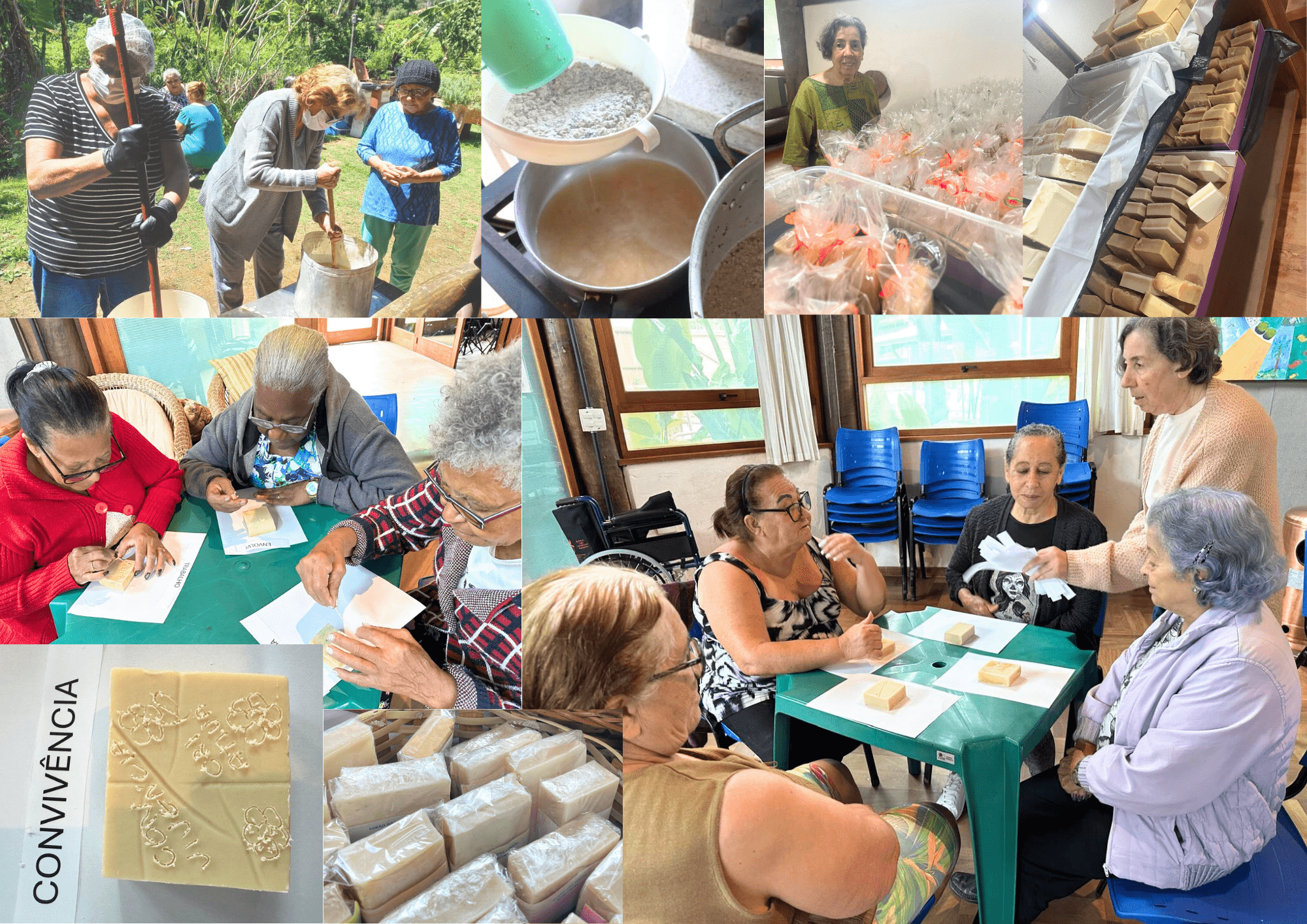 Na Oficina Convivência Criativa, organizada na Associação São Joaquim por Eleonora Sampaio Caselato, a feitura do sabão caseiro se mostrou um potente exercício de convivência. A atividade reuniu lembranças, memórias de infância, gestos aprendidos com mães, avós e vizinhas, além de muita curiosidade e desejo de aprender. Em roda, cada participante trouxe sua história, despertando vivências e ressignificando e construindo novas memórias.